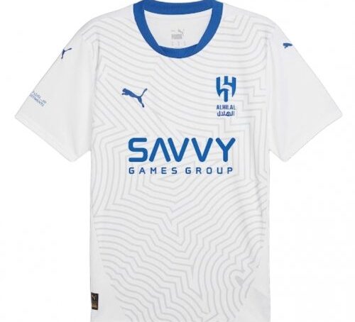 Ce maillot extérieur d’Al-Hilal présente un design élégant dominé par une base blanche sublimée de motifs géométriques fins, créant un effet visuel moderne et dynamique. Les détails bleus – notamment le col rond, le logo du club, l’emblème Puma et le sponsor Savvy Games Group – apportent un contraste net et stylé. Conçu par Puma, il offre un tissu léger et respirant, idéal pour la performance sportive comme pour un usage quotidien. Le maillot combine confort, esthétique et identité forte du club saoudien, en faisant une pièce prisée des supporters et des collectionneurs.