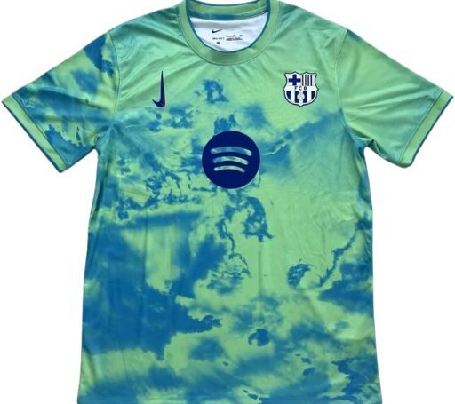 Ce maillot du FC Barcelone se distingue par un design artistique et vibrant, mêlant des nuances de vert et de bleu dans un motif nuageux qui donne un effet dynamique et presque aérien. Sur la poitrine, on retrouve le logo Nike placé en violet foncé, l’écusson du Barça dans son style contemporain bleu et blanc, ainsi que le sponsor central en bleu marine.