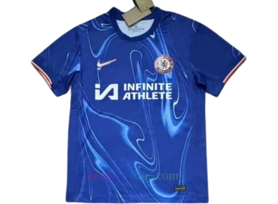 Ce maillot de football est principalement bleu royal, décoré de motifs fluides et ondulés dans des teintes plus claires, créant un effet dynamique et moderne. Sur la poitrine, on retrouve le logo du club de Chelsea sur la gauche et le logo Nike sur la droite. Le sponsor “Infinite Athlete” est imprimé en blanc au centre. Les manches présentent une petite bande tricolore rouge, blanche et bleue. L’ensemble donne un style sportif, énergique et contemporain, typique des maillots de match récents.