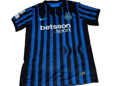 Ce maillot de football présente un design élégant composé de bandes verticales bleu électrique et noir, caractéristiques du style de l’Inter Milan. Le logo Nike apparaît sur la poitrine, à gauche du sponsor betsson.sport, tandis que l’écusson rond du club est visible du côté du cœur.